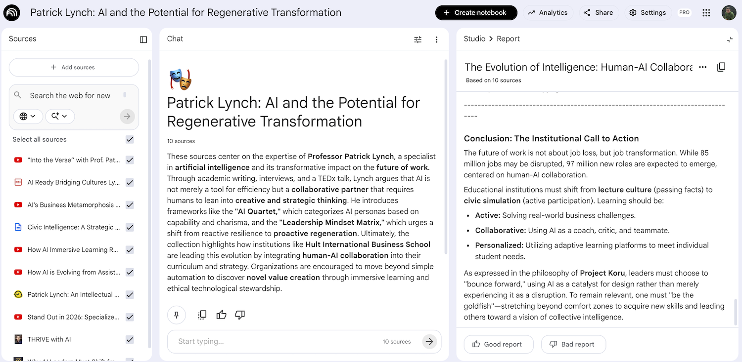 To prepare for this Civic Conversation, we have uploaded ten articles, interviews, and YouTube videos supplied by Patrick Lynch into NotebookLM. In so doing, we’ve created a chatbot that “knows” the entirety of his published thinking and can with great accuracy write and respond to questions on his behalf. It was from this resource we generated the brief bio and five questions I’ve published above.